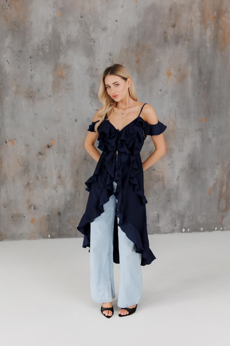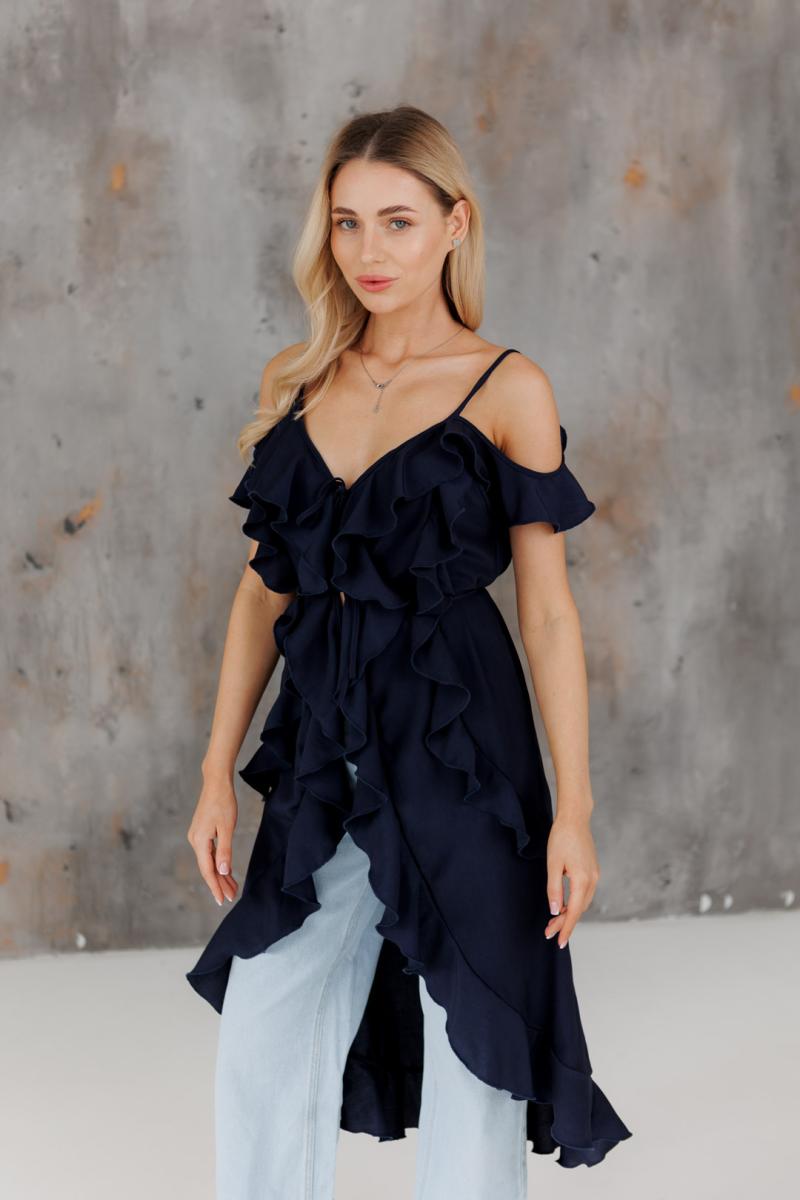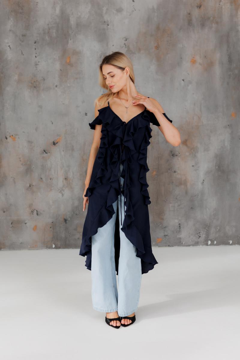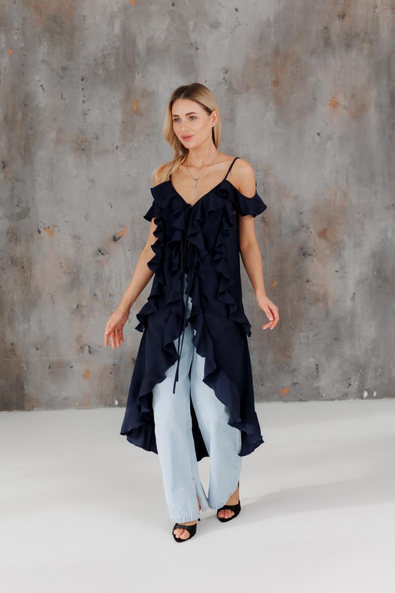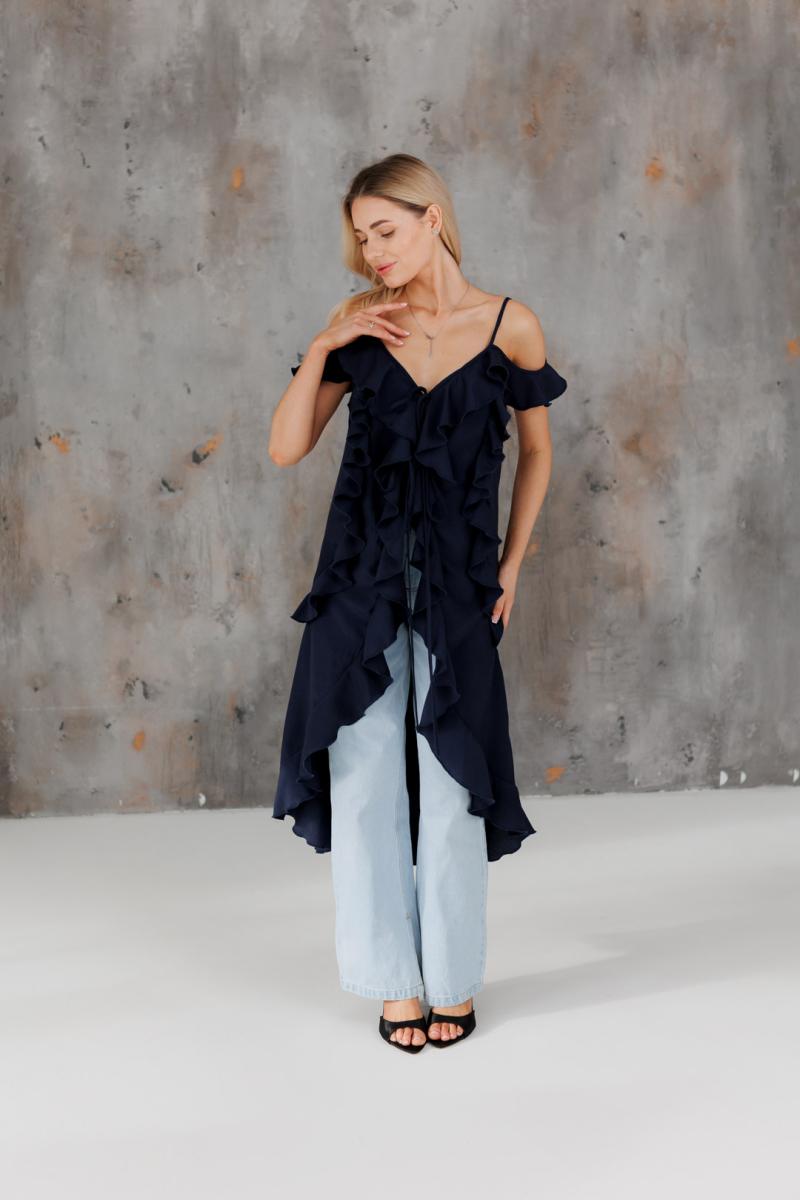 Блузка с воланами длинная синяя