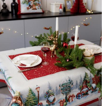 - Скатертина на новий рік: Вона має бути не тільки красивою, а й практичною. Зверніть увагу на новорічні скатертини від виробника.
