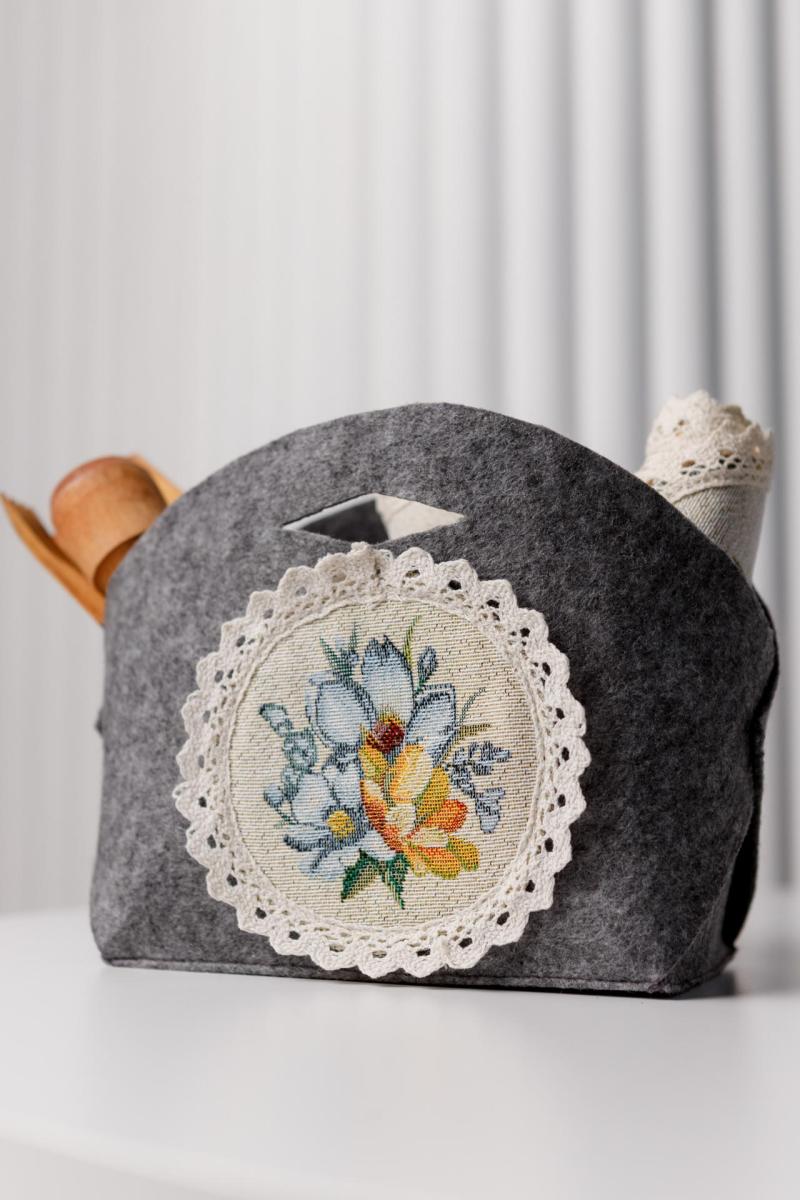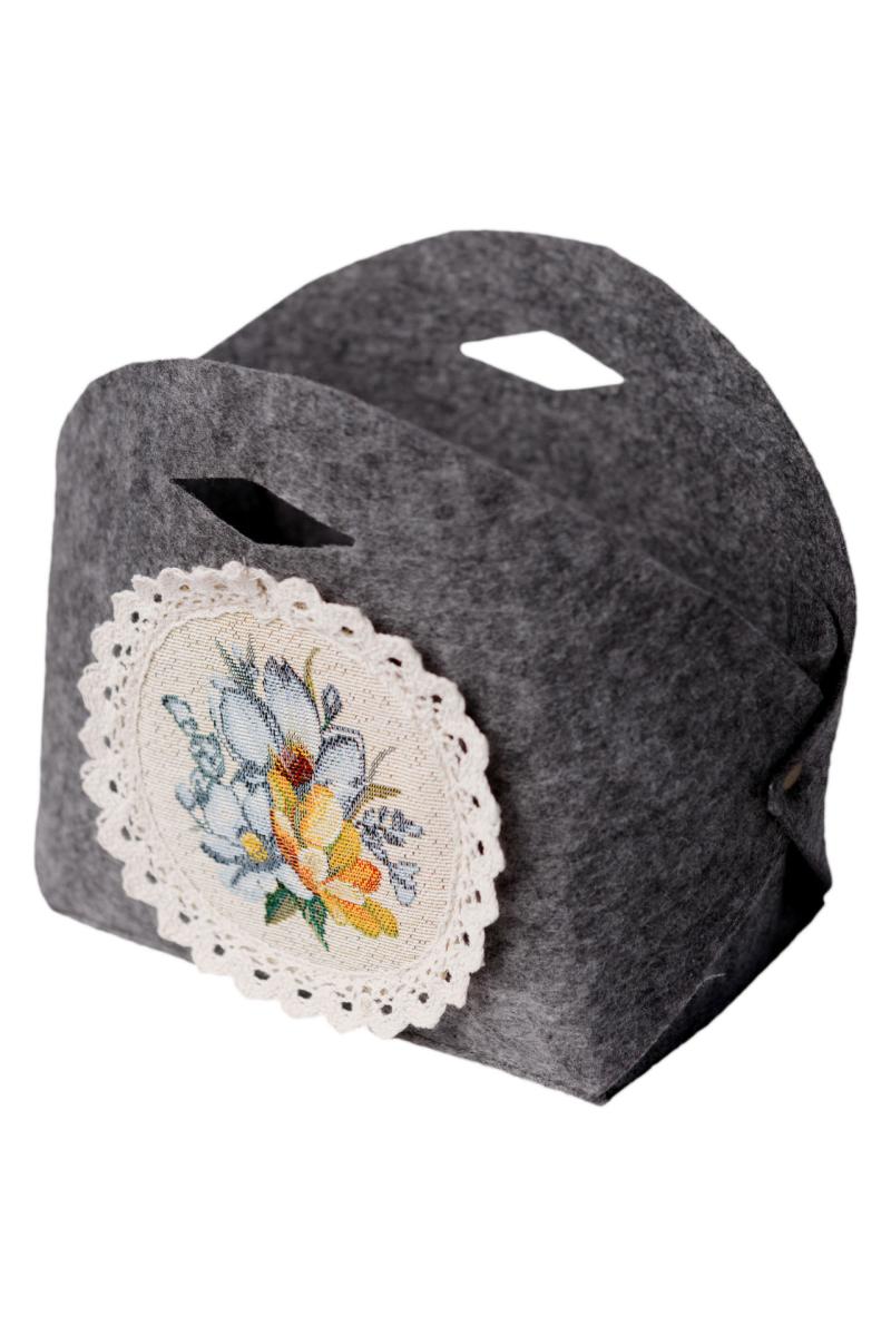 Чудово доповнить інтер'єр вашої кухні. Кошик виконаний з щільного фетру. Це стильне доповнення до подарунка сім'ї, друзям, родичам та колегам на честь великодніх свят. Також це прекрасне доповнення до скатертини, серветок, фартуха, доріжок, наволочок та подушок з великодньої колекції Рrimavera Розмір: 16х16см, висота 15см
