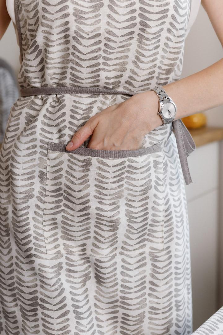Фартух з регулюванням за розміром. Фартух оздоблений зручною кишенею.