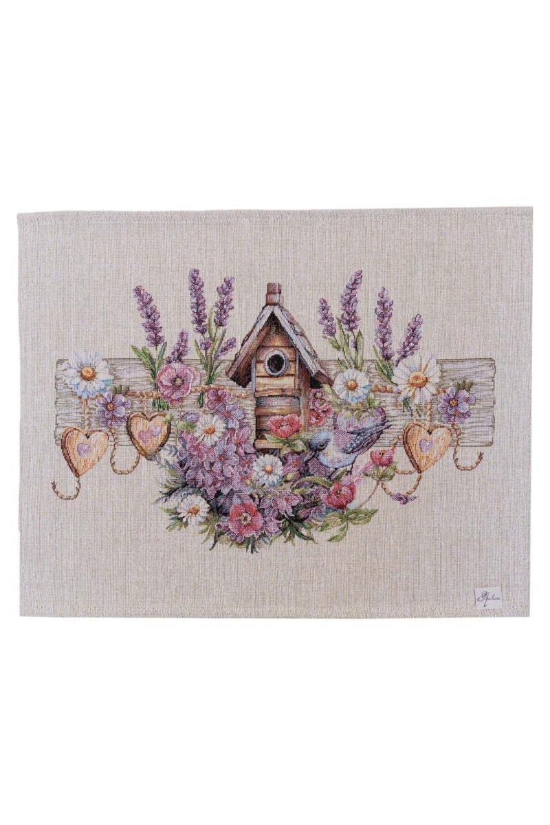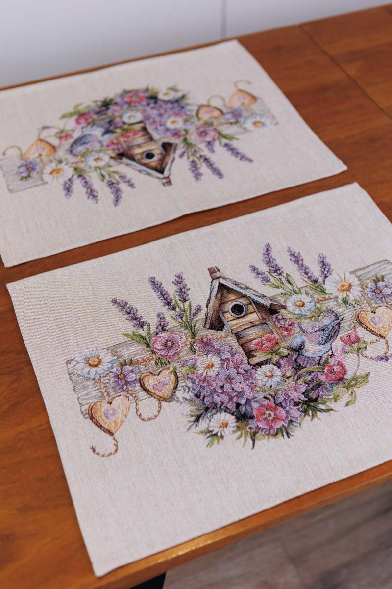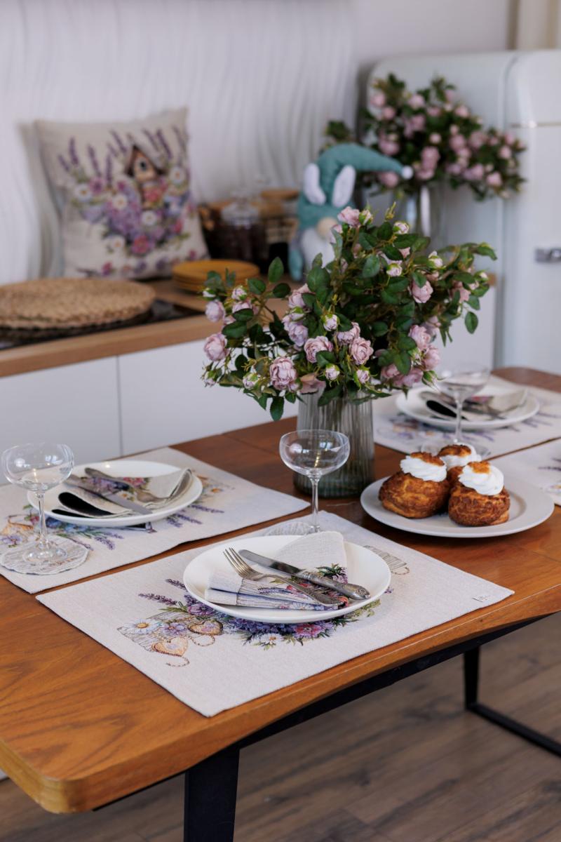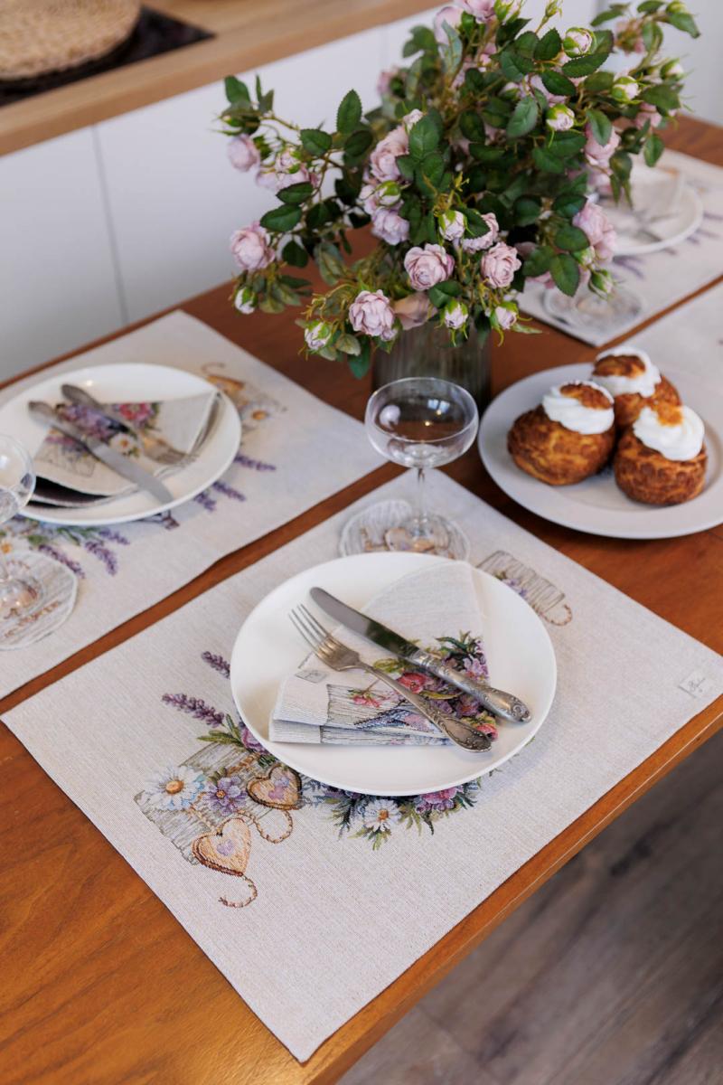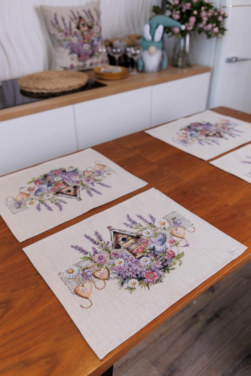 Серветка на стіл з гобеленової іспанської тканини. Це стильний подарунок сім'ї, друзям, родичам та колегам до весінніх свят. Також це прекрасне доповнення до скатертини, кошика, фартуха, доріжок, наволочок та подушок з весняної колекції Лавандовий садочок