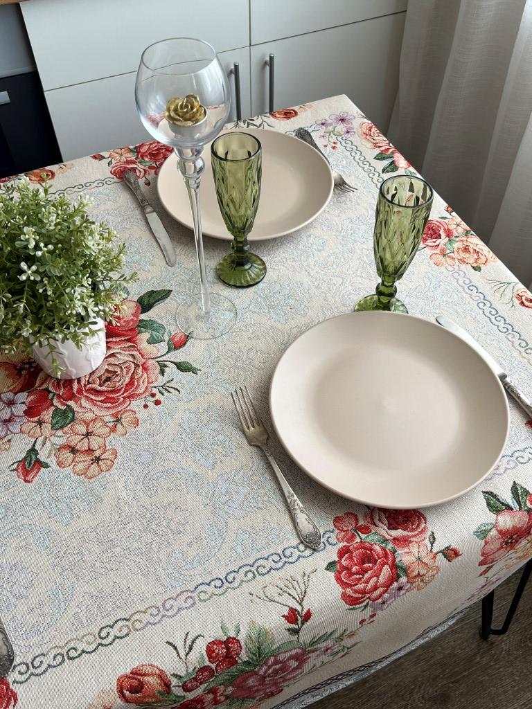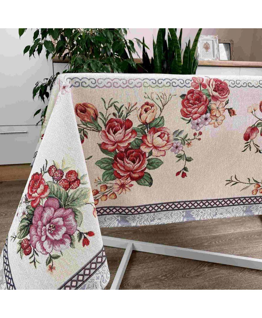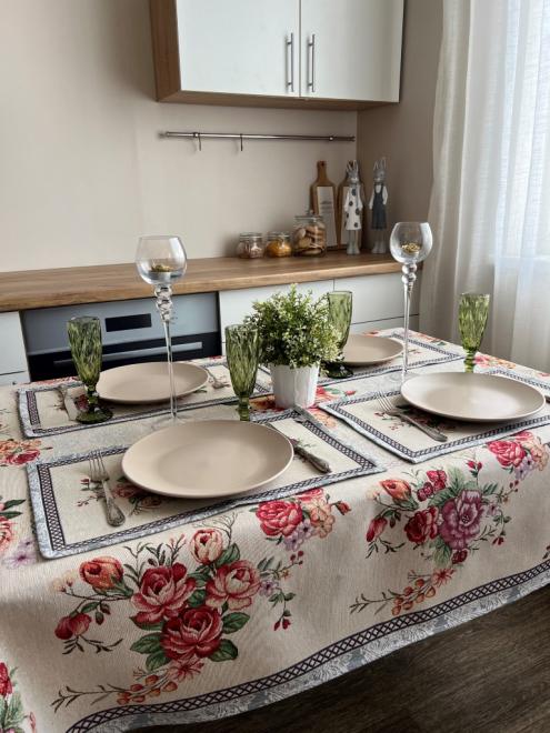 Скатертина прикрасить вітальню або кухню. Забарвлення буде відмінно гармоніювати зі світлими тонами меблів та текстилю в інтер'єрі.