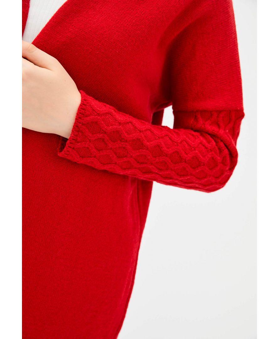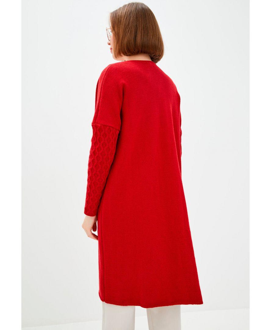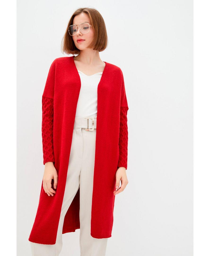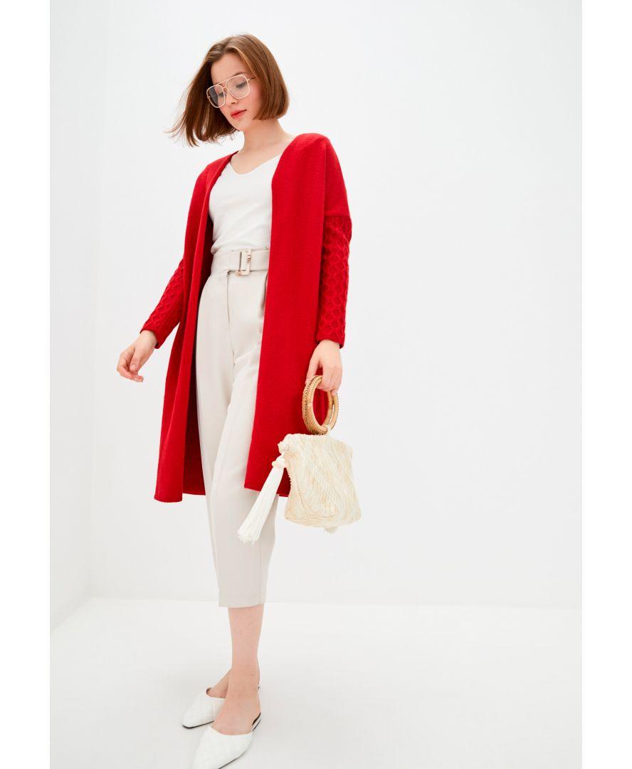 Кардиган жіночий червоного кольору з оригінальним рукавом в'язкою в коси. Кардиган можна носити з поясом або без. Платье продається з поясом. Платье пов'язаний з напіввовняної пряжі кольору гранат. Яскравий, красивий кардиган. Кардиган можна носити як з джинсами так і з брюками зі спідницями і сукнями, формуючи кожен раз новий образ.