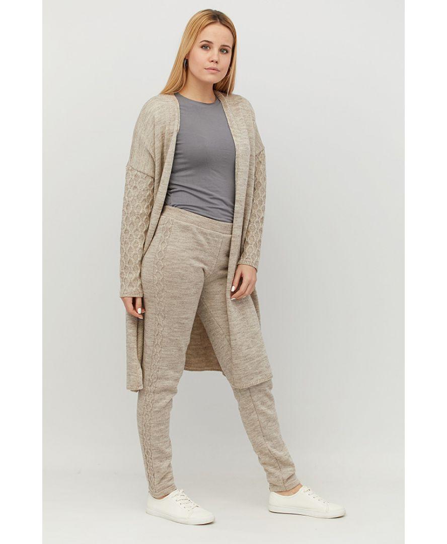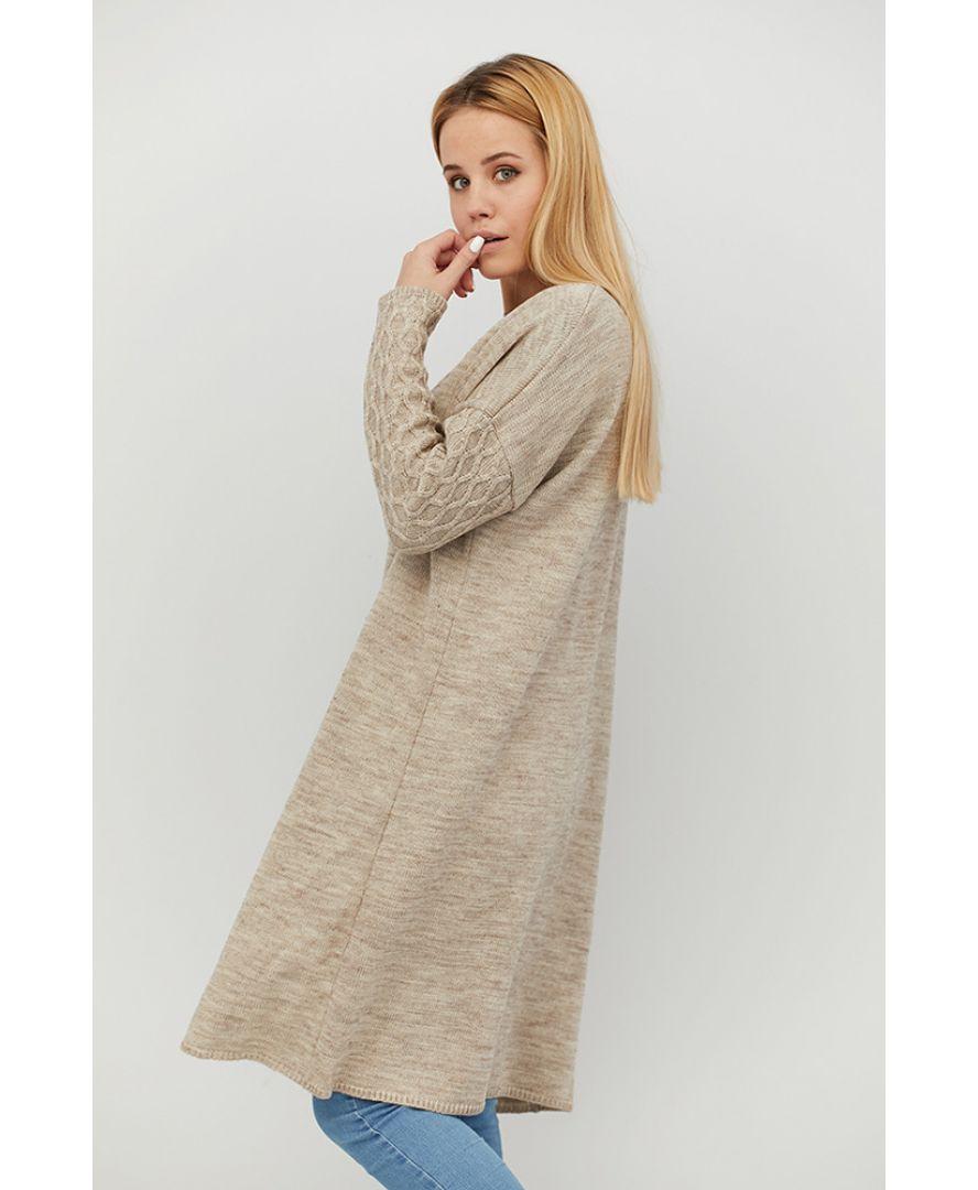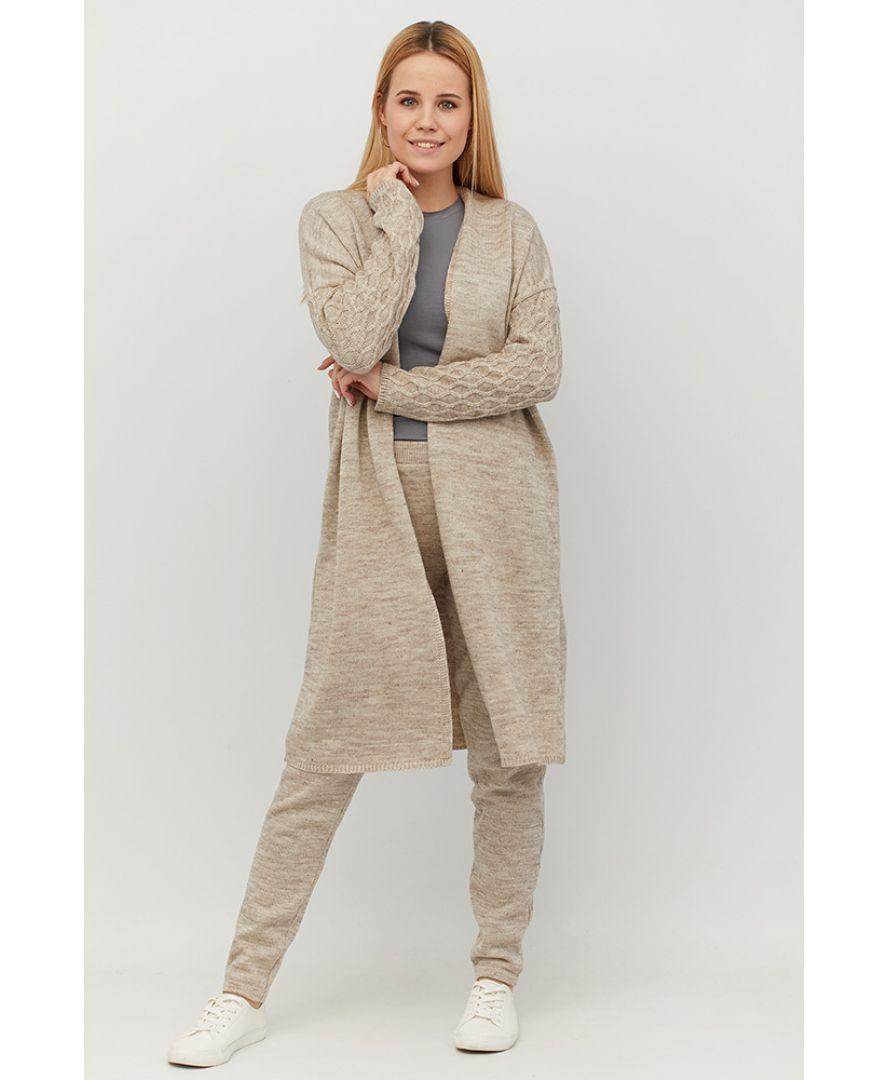 Платье пов'язаний з напіввовняної пряжі без пояса. Кардиган можна носити як з джинсами так і з брюками зі спідницями і сукнями, формуючи кожен раз новий образ.