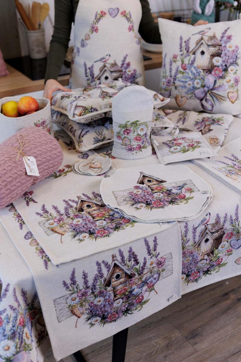 Стильний подарунок сім'ї, друзям, родичам та колегам до весняних свят. Також це чудове доповнення до скатертини, серветок, фартухів, доріжок, наволочок і подушок з весняної колекції Лавандовий садочок