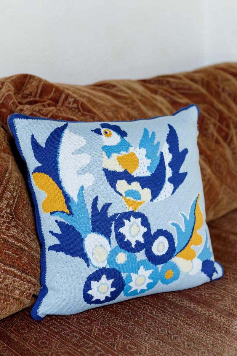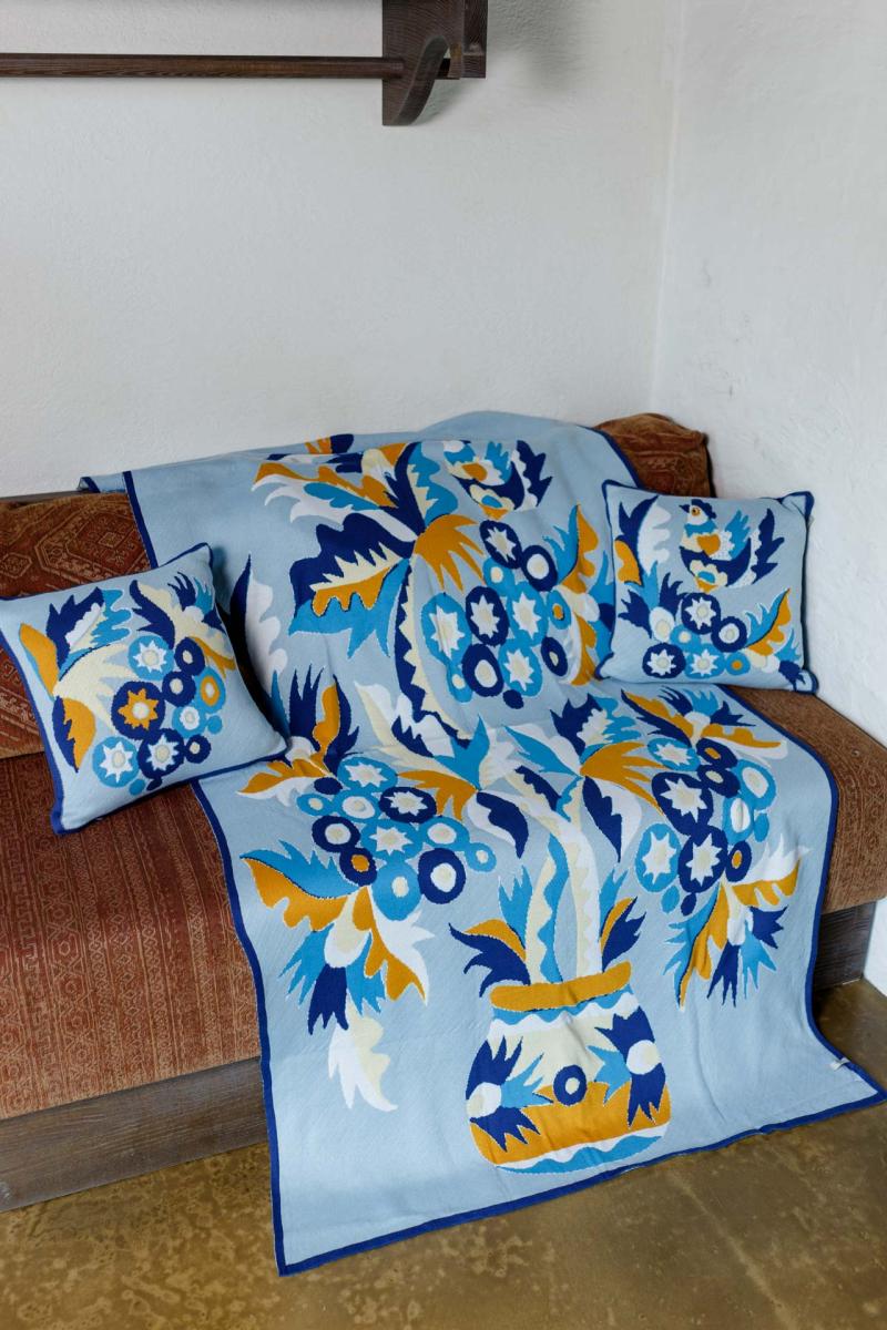 В'язана наволочка Самчиківські мотиви Спадщина Наволочка чудово прикрасить та доповнить інтер'єр вашої спальні, вітальні, будинку. В'язана наволочка в комплекті з пледом стане чудовим подарунком на будь-яке свято. Самчиківський розпис Насичені сині, жовті та білі відтінки на ніжному фоні. Квіткові композиції у вазах — це символ краси, гармонії та добробуту, який прикрашав оселі Поділля та Волині. Плед із цим орнаментом наповнює простір святковістю та світлом.