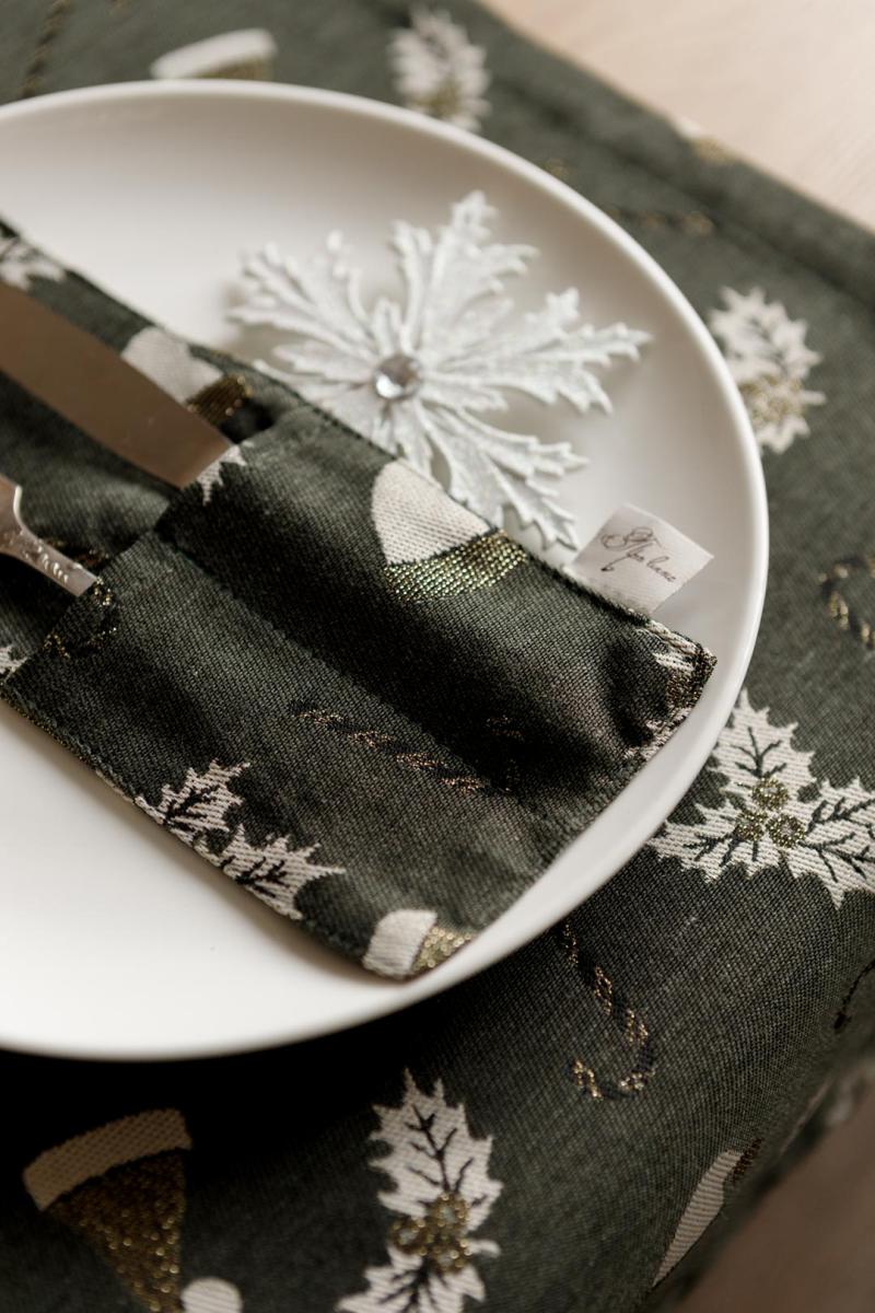 Шапочки на зеленому Чохол для столових приборів це те, що потрібно для прикраси святкового столу. Якiсна iспанська тканина. Склад тканини: 30% бавовна, 65% поліестер, 5% люрекс