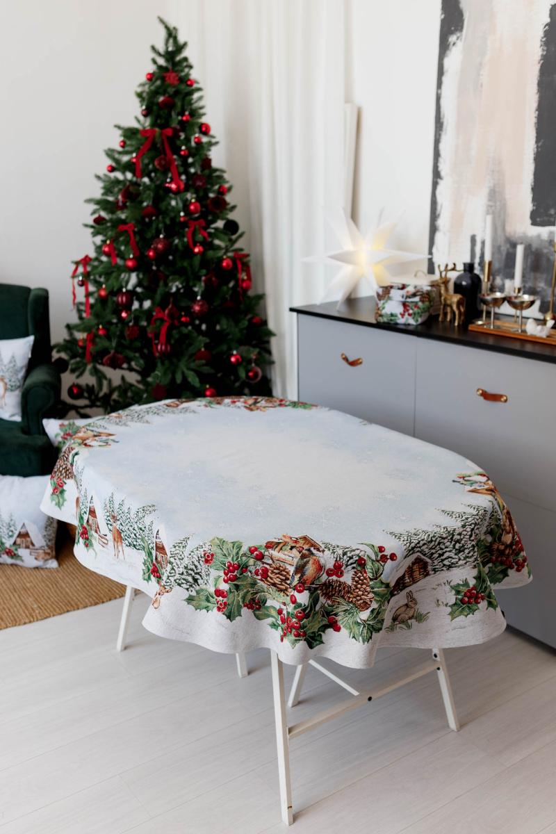 Скатертина прикрасить вітальню або кухню. Забарвлення буде відмінно гармоніювати зі світлими тонами меблів та текстилю в інтер'єрі.