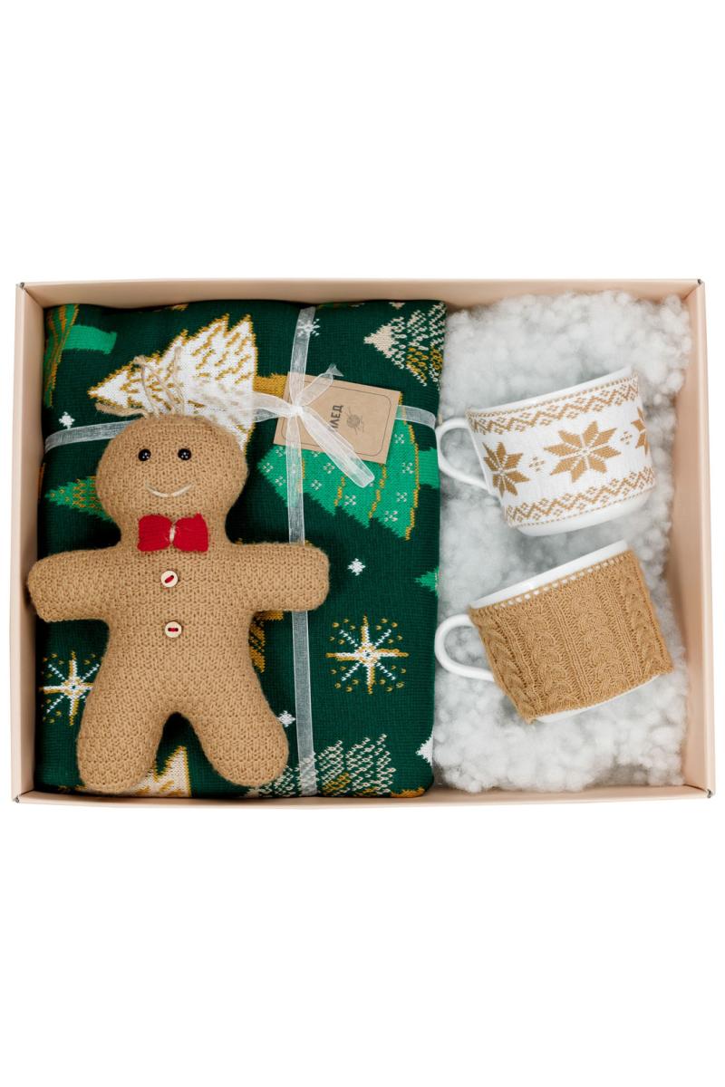 В набір входить:плед 90х130, дві чашки по 300 мл, іграшка в'язана Пряник.