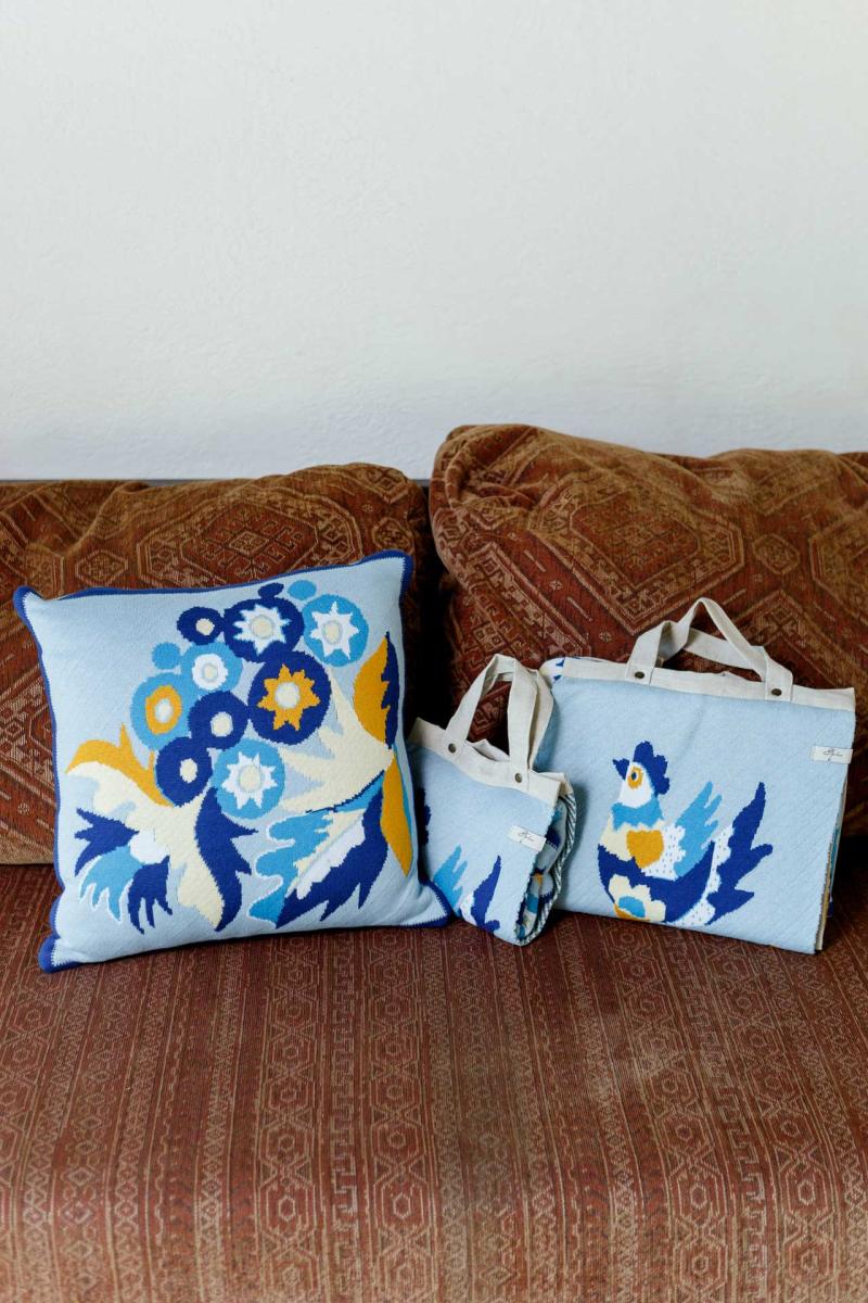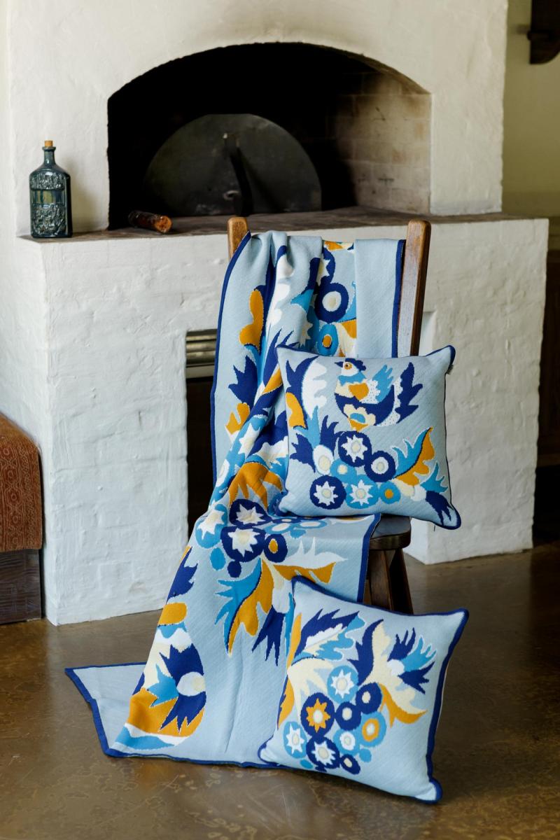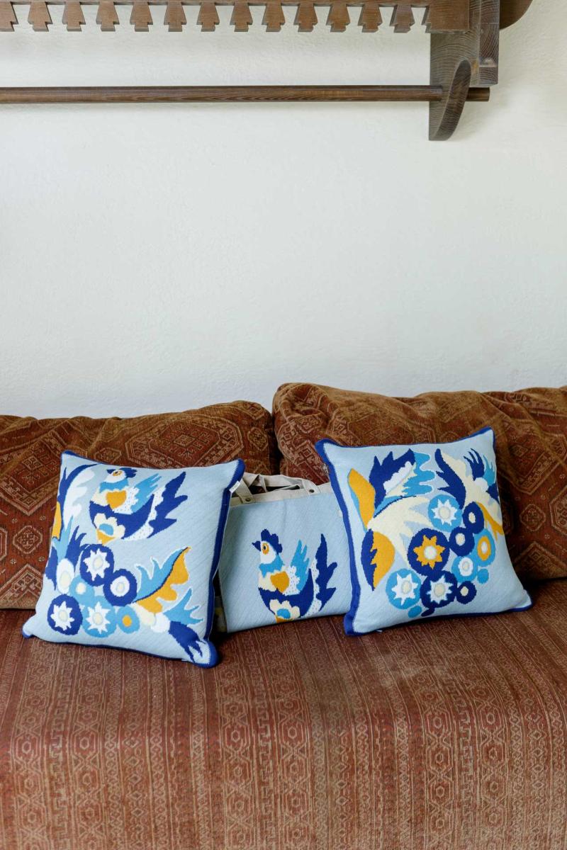 В'язана подушка Самчиківські мотиви Спадщина Подушка чудово прикрасить та доповнить інтер'єр вашої спальні, вітальні, будинку. В'язана Подушка в комплекті з пледом стане чудовим подарунком на будь-яке свято. Самчиківський розпис Насичені сині, жовті та білі відтінки на ніжному фоні.