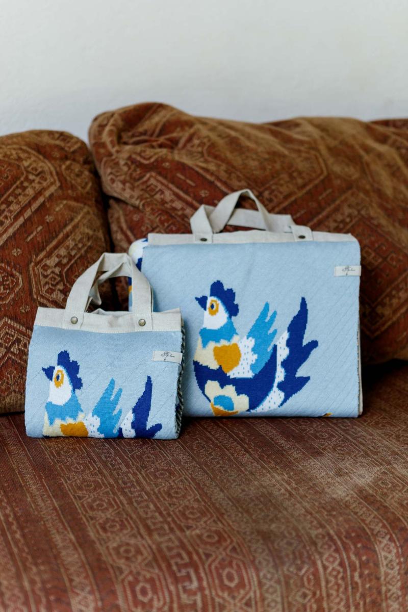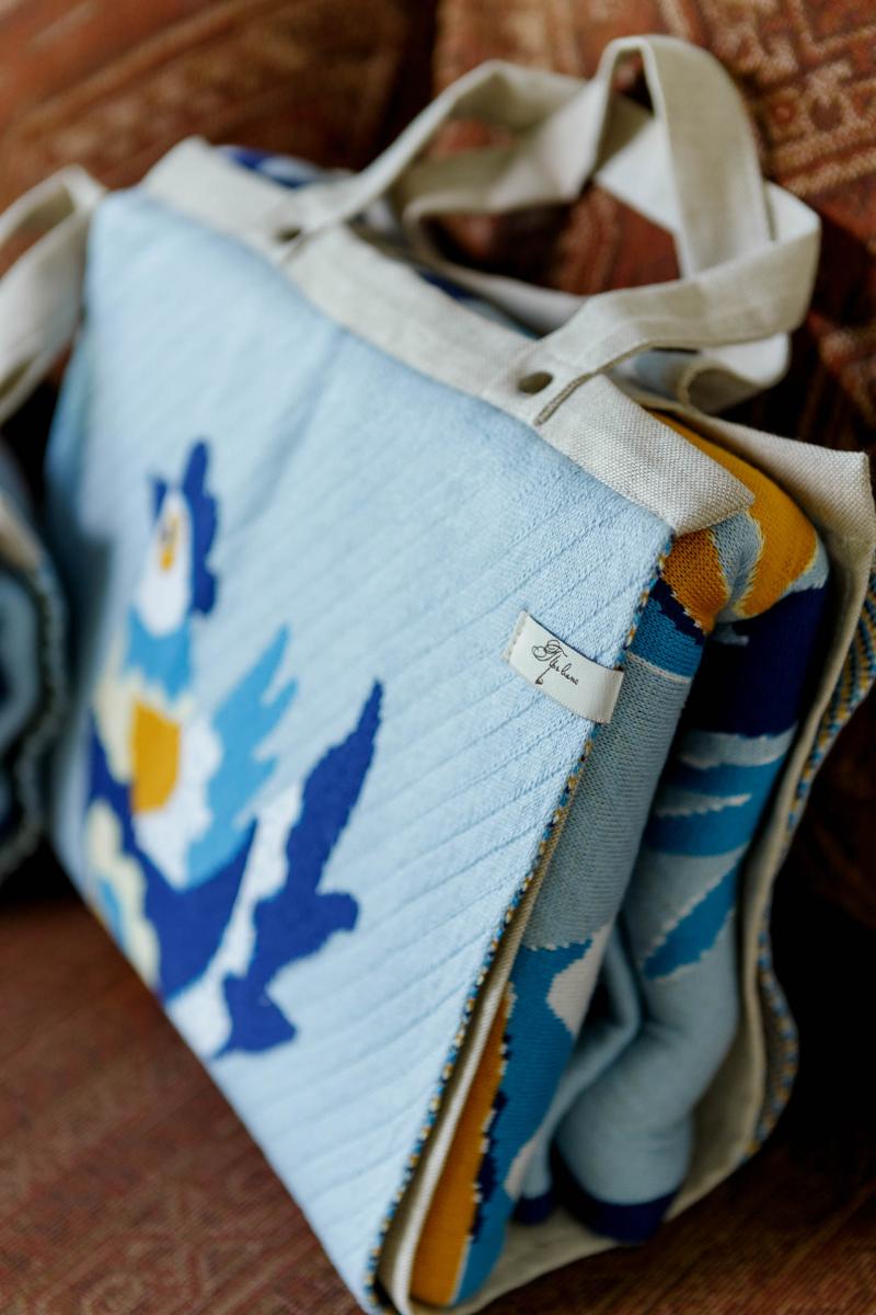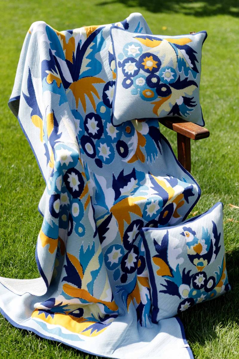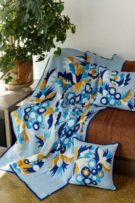 У кожному пледі цієї колекції — історія, яка народилася в українських селах і містечках, у майстернях народних художників і на сторінках старовинних орнаментів. Самчиківський розпис Насичені сині, жовті та білі відтінки на ніжному фоні. Квіткові композиції у вазах — це символ краси, гармонії та добробуту, який прикрашав оселі Поділля та Волині. Плед із цим орнаментом наповнює простір святковістю та світлом.