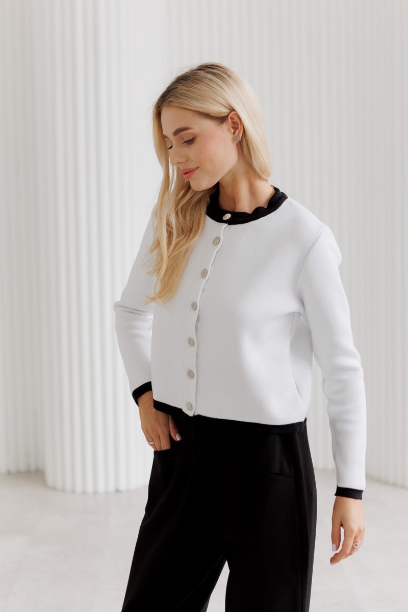 Вишуканий в'язаний жіночий жакет фіксується на ґудзиках.