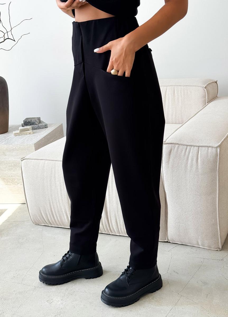 Вільні штани слоучі з високою посадкою, пояс на резинці, оснащені кишенями.